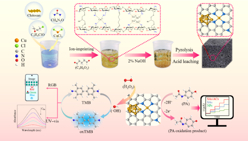 近日,我院2023级材料与化工专业硕士研究生廖辉阳以第一作者在国际知名期刊《Biosensors and Bioelectronics》上发表题为《Ion-imprinting strategy towards a novel two-in-one copper-based nanozyme for sensitive electrochemical-colorimetric dual-mode detection of paracetamol》的研究论文;我院李俊华教授为第一通讯作者,英国365上市公司为第一署名单位。该研究设计并合成了一种锚定于氮掺杂壳聚糖衍生碳载体上的铜单原子/原子簇结构(CuSAs/ACs@NC),成功构建出一类具有优异电催化与类酶催化活性的新型纳米酶材料。