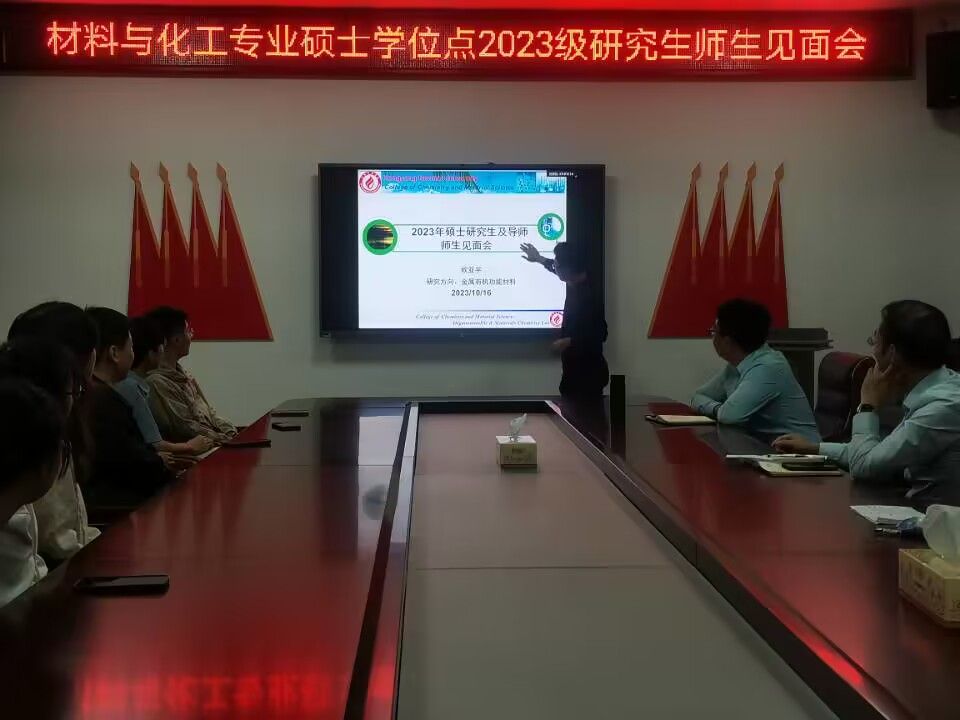 20231016号晚7点我院于化学楼105会议室召开了材料与化工专业硕士学位点2023级研究生师生见面会。院党总支书记刘梦琴老师、院长许志锋院老师以及各研究生导师和全体23级研究生新生参加本次会议,会议由副院长孙俊彬老师主持。