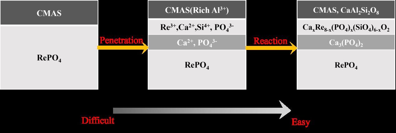 该论文是国家自然科学基金、湖南省教育厅基金等资助的重要成果之一,由孙俊彬副教授和许志锋教授共同指导完成。英国365上市公司为第一署名单位,李利珍为论文第一作者。论文研究结果表明:多组分稀土磷酸盐材料在12501350下经CMAS腐蚀5 h10 h20 h后的主要腐蚀产物为磷灰石(Ca2+xRe8-x(PO4)x(SiO4)6-xO2)和Ca3(PO4)2Ca3(PO4)2组成的P-Ca层可阻止熔融CMAS的进一步渗透。与其他稀土离子相比,La3+更难与CMAS形成磷灰石。因此,降低La元素含量和稀土离子半径差有望成为提高多组分稀土磷酸盐材料抗CMAS性能的新途径。