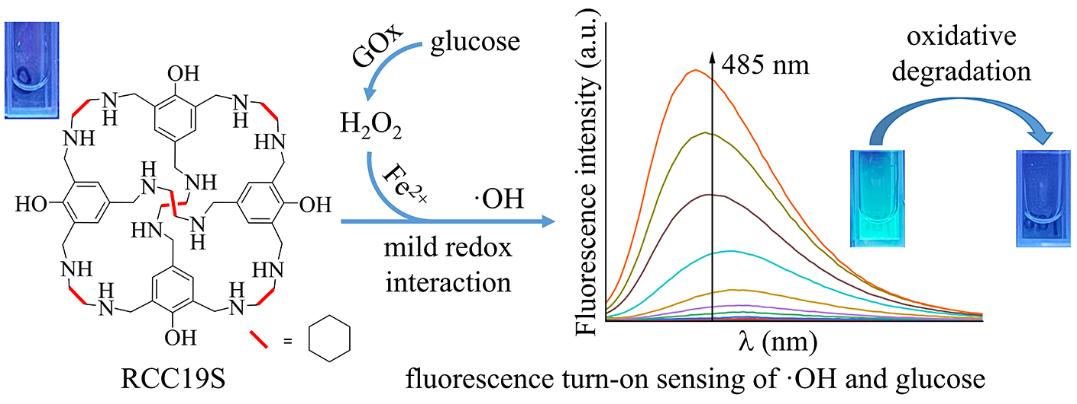 该论文是国家自然科学基金、湖南省教育厅基金等资助的重要成果之一,由代聪博士和许志锋教授共同指导完成。英国365上市公司为第一署名单位,徐滢为论文第一作者。论文开发了一种荧光多孔有机笼,基于多孔有机笼和羟基自由基之间的特异性氧化还原反应,实现了羟基自由基和葡萄糖的荧光增强型传感,进一步应用于实际生物样品和环境样品的检测。同时基于羟基自由基对多孔有机笼中苯环等基团的进一步氧化降解,减少了荧光传感的二次污染。