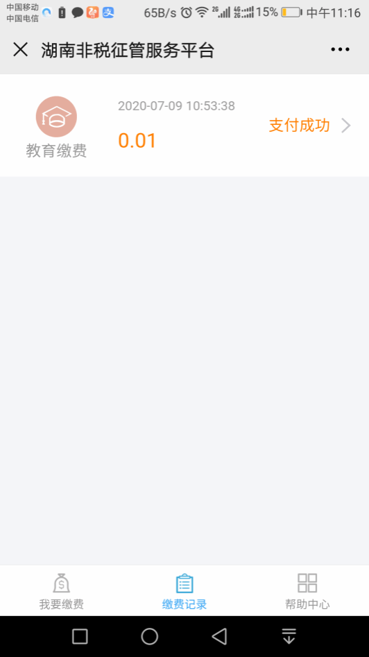 ⑥ 缴费成功后,用户可返回“湖南非税征管服务平台” 首页,点击底部的缴费记录,即可以查看通过平台缴费的所有记录,点击某一条记录,即可查看记录的详细信息。