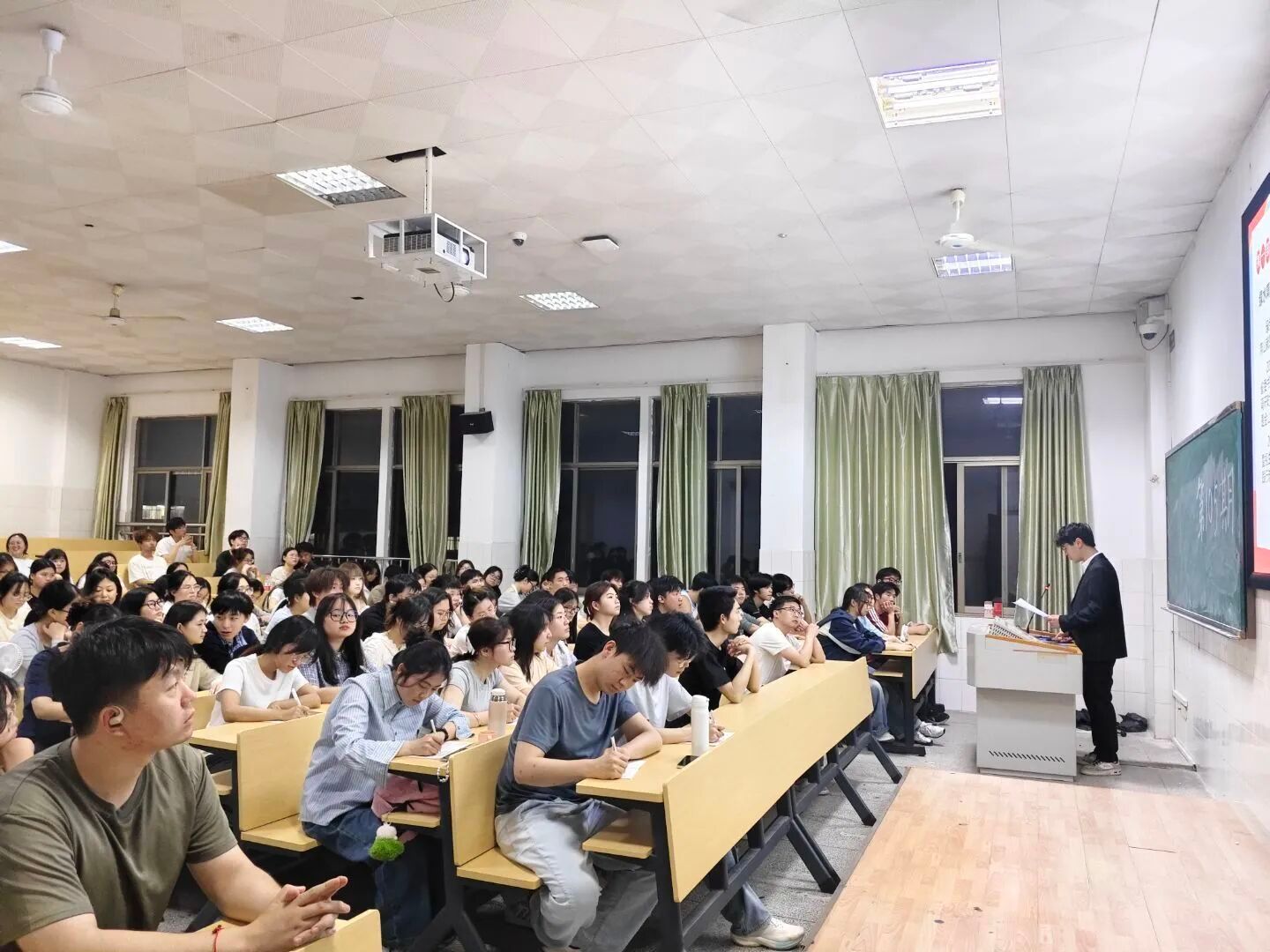 黎佳旺首先介绍了我国美丽中国建设取得的显著成效:森林覆盖率稳步提升,蓝天日益成为常态,公众生态环境满意度超过90%。他指出,2026年全国两会释放出鲜明绿色发展信号,提出以生态环境法典强化法治保障、推进碳市场有偿分配、大力发展未来能源等重要举措。当前我国紧扣绿色发展最新部署,向着碳达峰碳中和目标坚定迈进,通过精准控碳、分区治理,聚焦能源、产业、生态三大领域,用制度和法律护航,推动绿色发展落到实处。随后,他结合邹雨芹、吕春祥等科技工作者深耕绿色科研、突破关键技术的先进事迹,引导大家厚植科学精神、坚守绿色理念、胸怀家国担当。最后,他立足学院专业特点,从源头绿色化、末端资源化、思想绿色化三个层面,和大家分享化材学子如何利用专业所长守护绿水青山、践行绿色发展。