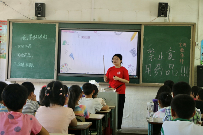 朱贤友一行先认真观看了志愿者们精心制作的展板,参观了志愿者的食宿环境。随后,他们来到四(一)班的教室聆听志愿者邓鑫蕾的科学课《化学红绿灯》。只见孩子们一个个正全神贯注地听老师介绍化学实验仪器、实验药品以及实验步骤。理论知识讲解之后,在志愿者们的组织和指导下,每个小组长排队拿着仪器依次添加化学试剂,并按照老师的实验要求操作,很快便出现了红、黄、绿三种颜色的变化,这一神奇的现象令孩子们好奇和兴奋不已。