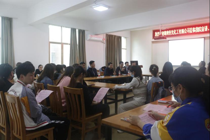 首先,刘梦琴代表学院对湖南恒光化工有限公司的到来表示热烈欢迎,并向来宾简要介绍了我院基本情况;接着湖南恒光化工有限公司总经理陈建国讲话,他从自身趣事谈起,指出化工类就业前景广阔,大有作为。陈总以过来人的感受告诫学生——一个成功的人都是从基层干起,希望学生努力学习,磨砺出好品质、好心态,积极应聘,扎实从基层做起,开拓出属于自己的一片新天地。最后,刘梦琴殷切寄语毕业生:要先就业再择业,而提高就业的核心竞争力就要立足于自身的专业实力,为此,在平时的专业学习一定要深钻进去,学到过硬本领,在广阔的就业之路上发挥出夺目的光彩。