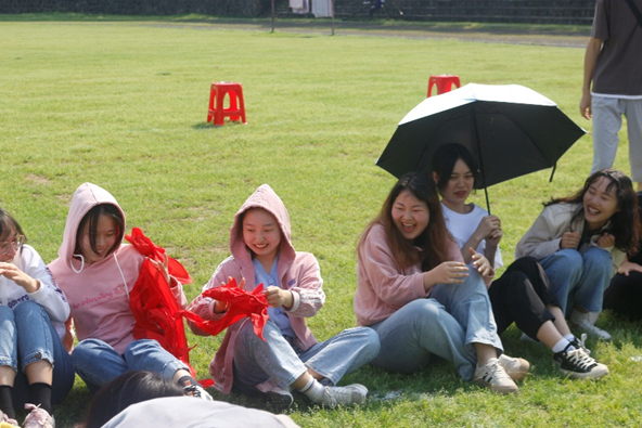 活动通过开场的热身小游戏——“击鼓传花”来完成队伍分配,游戏中的才艺表演环节让足球场充满欢声笑语。最考验院干们团队意识的便是“党史知识竞答”环节,该环节共分为三个赛区,第一个赛区的队员吹起气球,以背靠背的方式夹住气球运送到下一赛区。第二赛区的两名队员接过气球,用胸口夹住将其送往第三赛区。最后一个赛区的队员用腿夹住气球,采用双腿跳的方式将气球运送到终点并将其压爆后,即可进行党史知识竞答。此外,“以小见大”和“突破重围”两个游戏环节也大大增强了院干之间的沟通交流和团队凝聚力。活动中,尽管有些队伍排名落后,但他们不畏强手、奋力拼搏,为团队荣誉而战的精神和担当值得大家点赞。