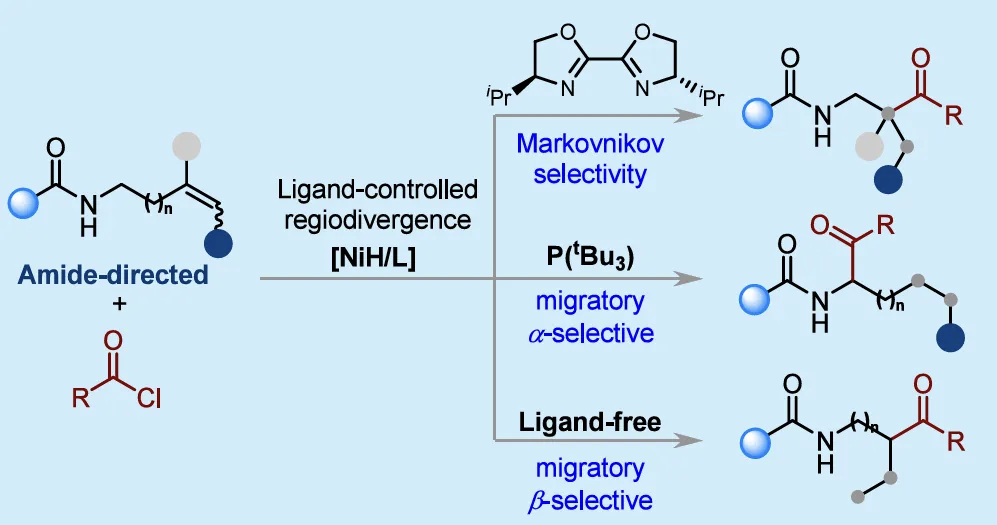 该论文是国家自然科学基金、湖南省教育厅基金等资助的重要成果之一,由李文艺教授和王超教授共同指导完成。英国365上市公司为第一署名单位,冯浙泰为论文共同第一作者。论文研究结果表明:我们开发了一种由配体控制、酰胺导向的镍催化反应体系,可实现未活化烯烃与易得酰氯的氢酰化反应,从而能够通过区域发散性合成获得结构多样的支链酮类化合物。通过合理的配体调控,该策略既可保持马氏选择性(Markovnikov selectivity),又能实现迁移型α/β选择性。该反应在温和条件下进行,具有广泛的底物适用范围,且能兼容多种官能团。我们预计,这一高效稳定且具有模块化特点的实验方案将在合成有机化学领域得到广泛应用,尤其可用于高效制备含酮类骨架的化合物,为药物研发提供支持。