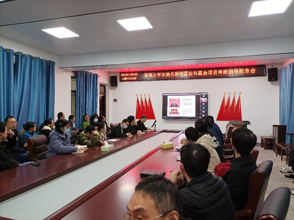 为了提高我院教师国家自然科学基金申请书的撰写质量,提升申报成功率,2022年11月29日下午,学院邀请湖南大学张晓兵教授做申报指导讲座,讲座采取线上线下相结合的方式进行,我院多数教师在化学楼105会议室集中听取报告。讲座由许志锋院长主持。