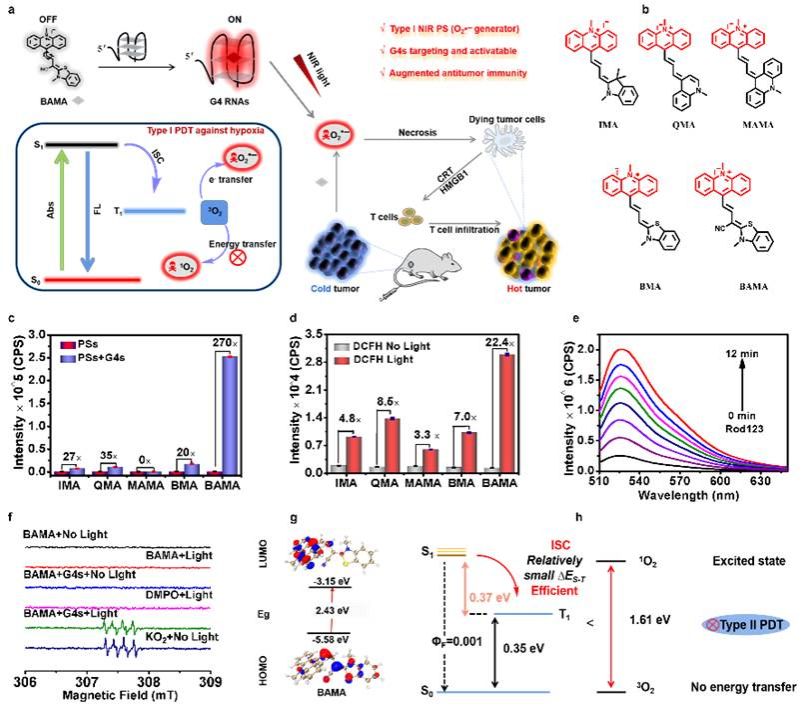 为实现肿瘤缺氧微环境的精准高效治疗,本论文基于吖啶衍生物开发了一系列具有G-四链体 RNA 靶向激活的I型光敏剂荧光探针,经体外和活细胞实验表明,BAMA不仅可以对细胞进行荧光成像分析,且在特定波长光源照射下的缺氧环境也具有高效的O2·-产率,通过消融肿瘤内G-四链体 RNA诱导免疫性细胞死亡ICD,RNA测序(RNA-seq)分析显示,BAMA诱导了与氧化应激、免疫和细胞死亡有关的基因表达的显著变化,以及致癌和功能性RNA G4的消减。