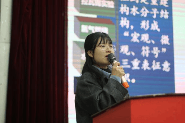 片段教学以及说课环节在师范生技能大赛中举足轻重,为此,我院特邀了2020届优秀校友、衡阳市成章实验中学的李娟老师上了一堂《水的组成》片段教学和说课的示范课。李娟老师此前曾在湖南省实验教学说课竞赛和实验操作教学竞赛中荣获一等奖和二等奖的好成绩,她用巧妙的教学设计,简练流畅的语言,环环相扣、条理清晰地为同学们呈现了一堂精彩的示范课,赢得了现场观众热烈的掌声。随后,20级化学4班的尹琳琴同学作为今年全国师范生技能大赛参赛选手,分享了自己参赛的经验,并为大家带来了《铁盐和亚铁盐——探秘铁肥的变质》的片段教学展示。潘蕊同学在听完他们的课堂展示后说道:“李老师的课堂展示让我们师范生深受启发,让我们清晰地认识到了一位优秀的老师应该具备怎样基本素养和专业能力。”