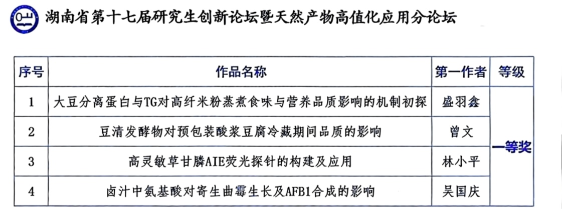 2024年11月15日,湖南省第十七届研究生创新论坛暨“天然产物高值化应用”分论坛在邵阳学院成功举办。本次论坛由湖南省教育厅主办,邵阳学院食品与化学工程学院承办,吸引了来自全省多所高校的优秀研究生踊跃参与。我院2022级研究生林小平及其团队凭借题为《高灵敏草甘膦AIE荧光探针的构建及应用》的学术报告,从众多参赛作品中脱颖而出,荣获一等奖!