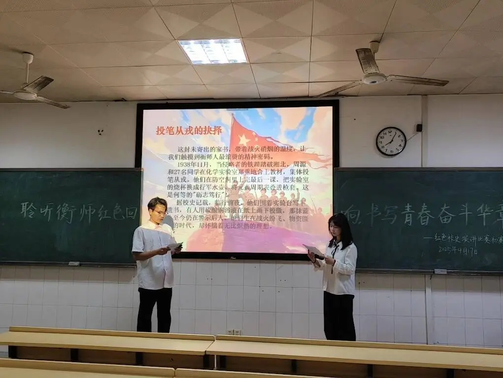 为深入挖掘学校红色历史资源,激励广大师生赓续红色血脉,弘扬革命精神,我院于2025年4月17日晚在西校区行知楼401、402举行了“聆听衡师红色回响,书写青春奋斗华章”红色校史演讲比赛初赛。
