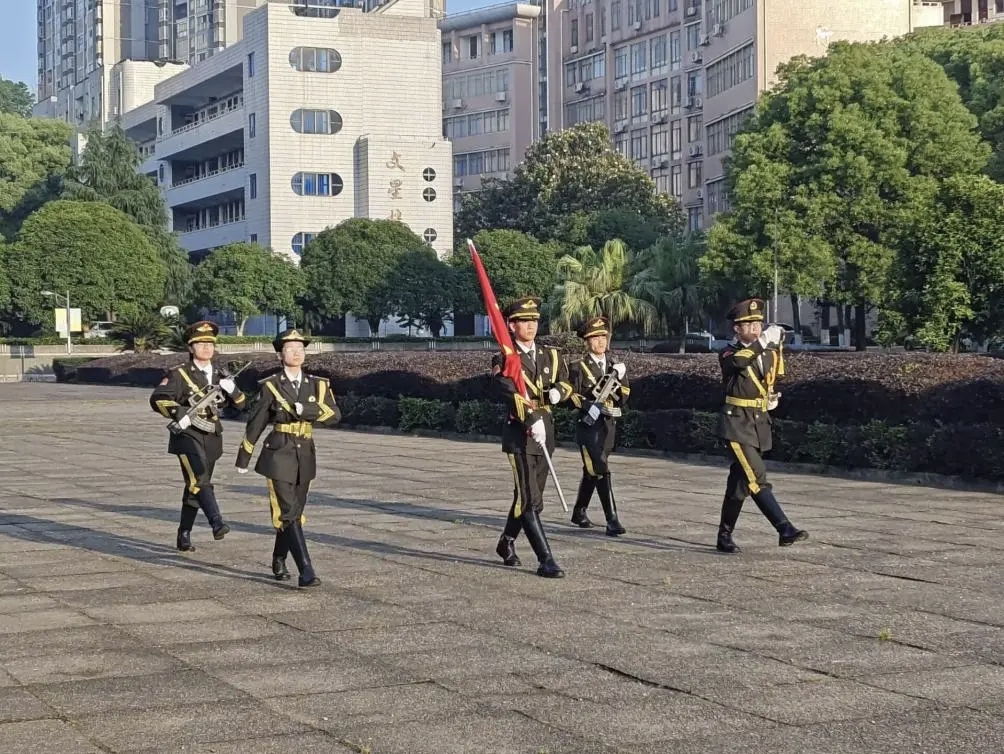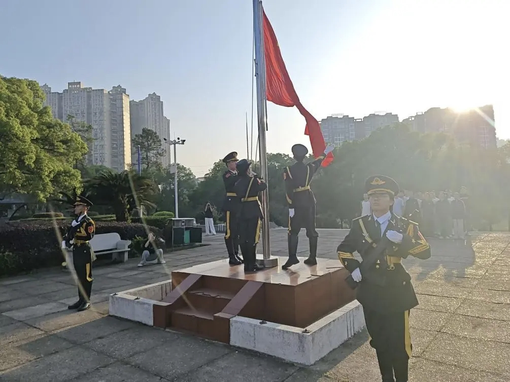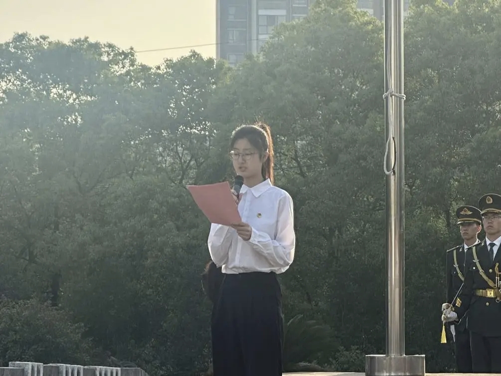 晨光熹微中,新世纪广场笼罩着肃穆的氛围。教导队成员们身姿挺拔、队列严整,以坚毅的姿态护卫着五星红旗,迈着铿锵有力的步伐走向升旗台。当《义勇军进行曲》激昂的旋律响起,全体学生神情肃穆,目光紧随那抹鲜红冉冉升起。晨风拂过,五星红旗在曙光中舒展飘扬,爱国之情在每个人心中澎湃翻涌,责任感与使命感亦如朝阳般升腾。