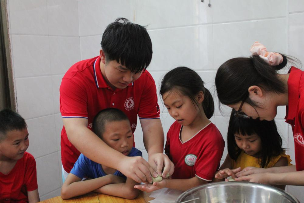 (志愿者教孩子们包艾叶粑粑)