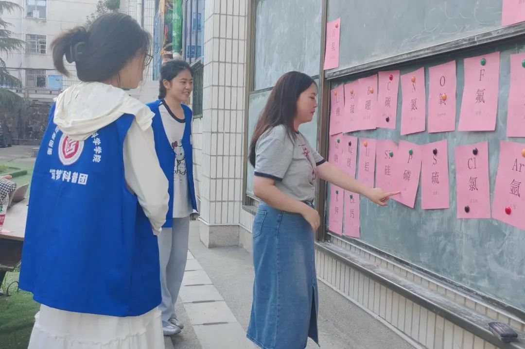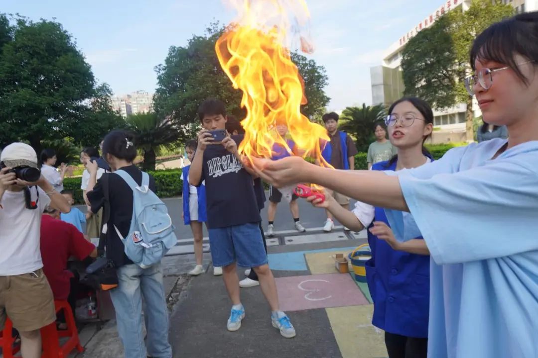 同学们穿梭于各个展位之间,有的认真聆听志愿者的讲解,了解化学元素的奥秘;有的则动手参与实验,亲自感受化学反应的奇妙。知识闯关区设置了化学方程式配平、元素周期表拼图、化学知识问答等与化学相关的趣味问题,动手体验区更是吸引了众多学生的目光,不同形状的火焰掌、烧杯里呈现的樱花雨、喷涌而出的大象牙膏等实验现象,激发了同学们的参与热情,他们大胆尝试,体验着化学的魅力。此外,同学们在非遗糖画、非遗漆扇展位中制作了一个个不同的元素糖画,一把把美轮美奂的漆扇,收获着劳动的欢乐。尽管活动持续近三个小时,九大展位的志愿者们认真坚守好岗位,传递着化学人的热情和智慧。火焰掌展位负责人曾冰艳同学感慨道:“看到同学们在我们的指导下,成功在手上比划出各种形状的火焰露出的笑容时,我也很开心!”