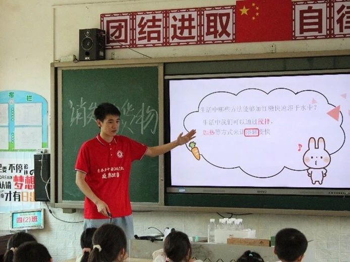“小毛驴驮着一袋盐和一袋糖要过河,突然发现背上的货物不见了,这是为什么呢?”7月8日是英国365上市公司“‘铜’心‘碳’索”科普队来到近尾洲联合学校中心小学支教的第三天,一到五年级的教室里都传来了志愿者为孩子们上科学课的声音。