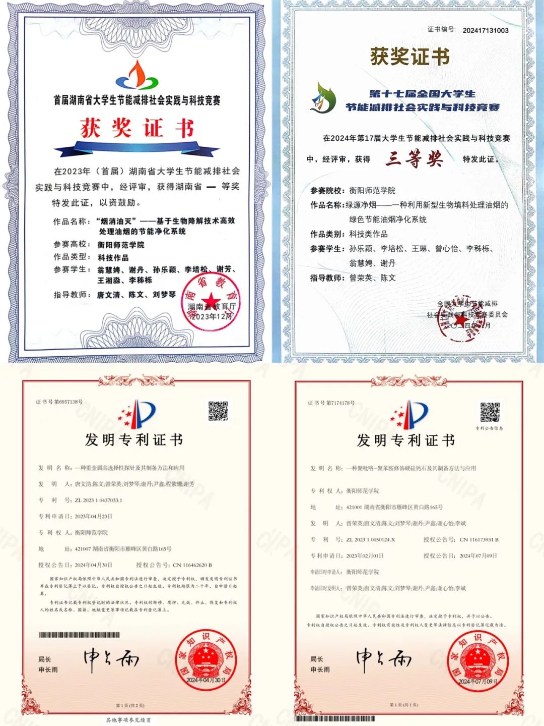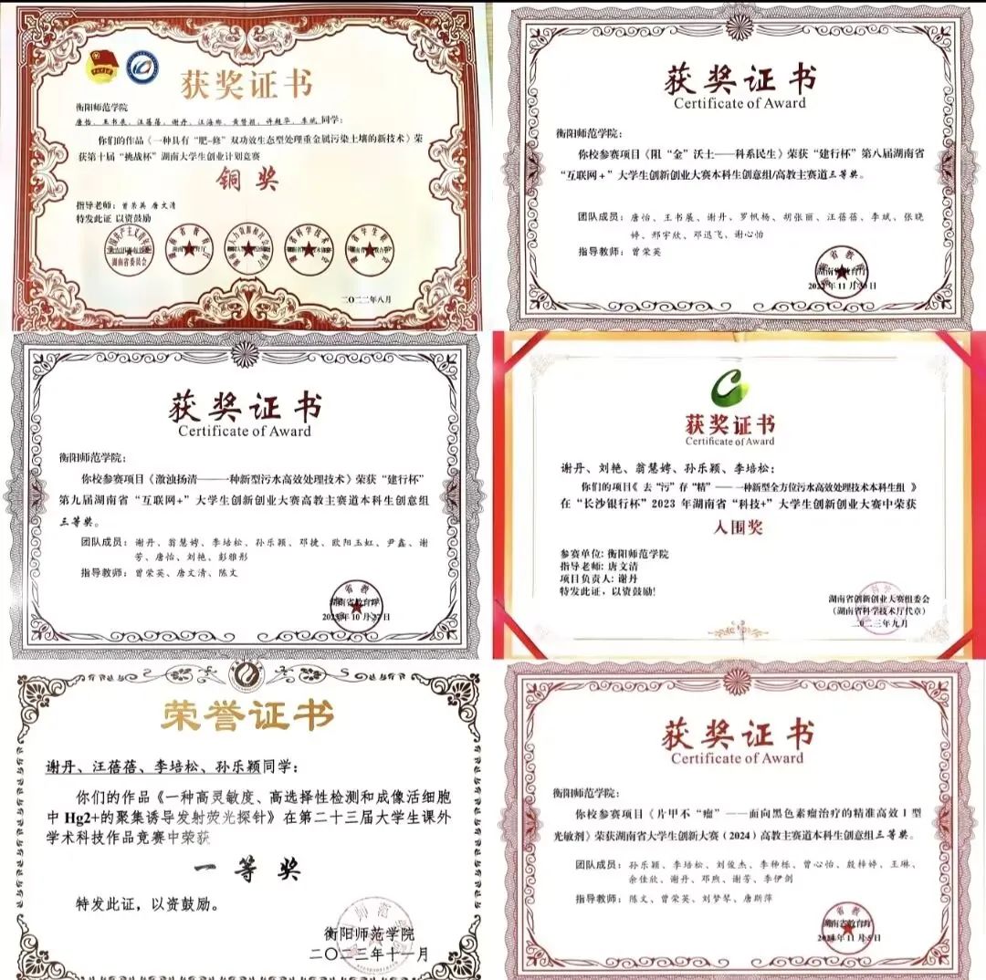 不满足于书本知识的她,踊跃投身各类学科竞赛与科技创新活动。在科创领域,她勇挑重担,担任光明科技创新团队组长,带领团队成员积极参与科研项目。在一次次思维碰撞与实践探索中,她屡获佳绩:2022年6月,在第十届“挑战杯”湖南省大学生创业计划竞赛中荣获省级铜奖;2022年8月,于“建行杯”第八届湖南省“互联网+”大学生创新创业大赛斩获省级三等奖;2023年8月,再次在“建行杯”第九届湖南省“互联网+”大学生创新创业大赛及湖南省“科技+”大学生创新创业大赛中获奖;2023年7月,参与发表一篇SCI二区论文;2023年12月,荣获首届湖南省大学生节能减排社会实践与科技竞赛一等奖;2024年8月,在全国大学生节能减排社会实践与科技竞赛、第十届湖南省“互联网+”大学生创新创业大赛中均获三等奖;2024年11月,再度拿下湖南省大学生节能减排社会实践与科技竞赛一等奖,同年申请两项发明专利。这些耀眼成果,不仅锻炼了她的实践能力与创新思维,更坚定了她在学术道路上继续奋进的决心。