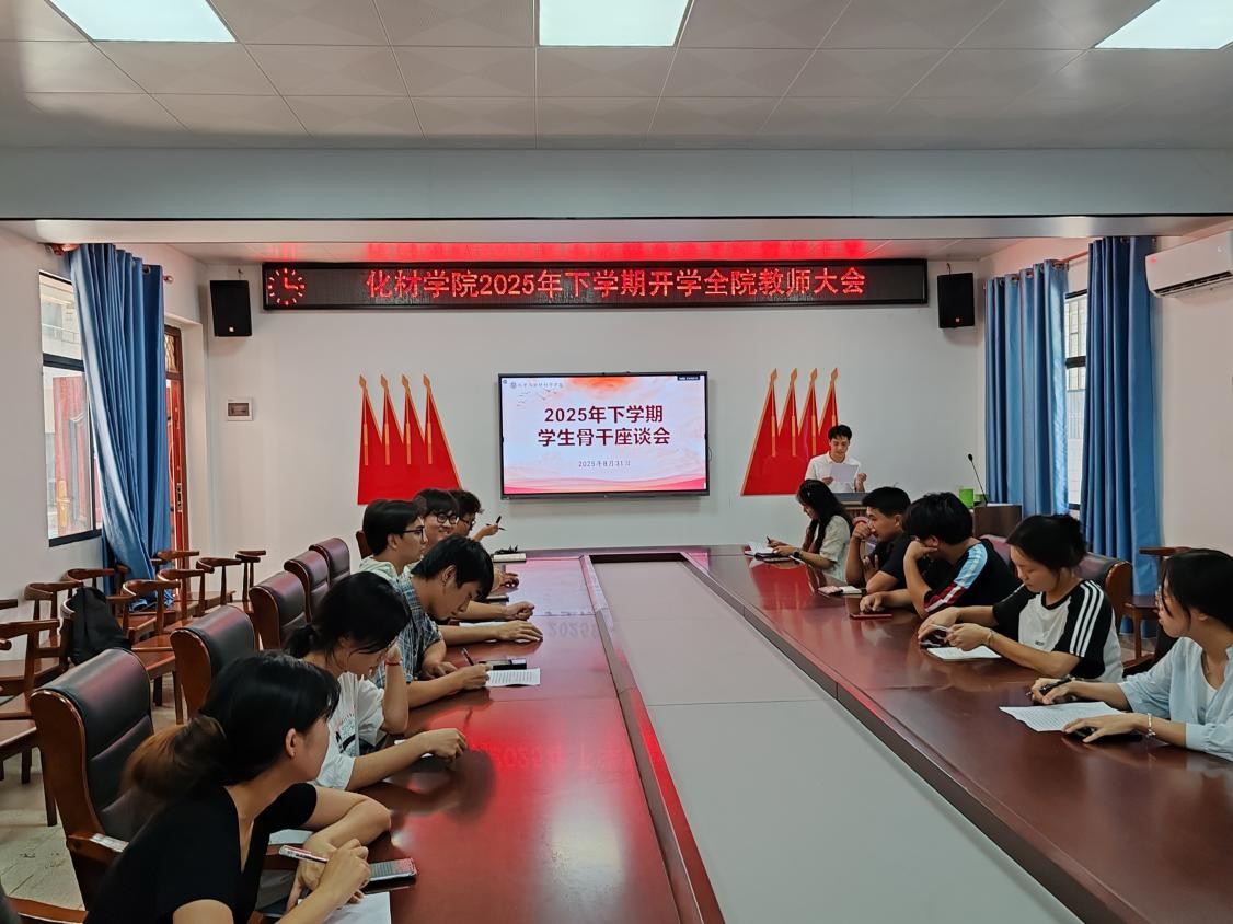 为进一步加强学生骨干队伍建设,充分发挥学生骨干在自我管理、自我服务中的引领作用,确保新学期学院各项工作正常开展,我院于8月31日下午三点在化学楼105召开2025年下学期学生骨干座谈会。党总支副书记阳曼、学工办主任唐升、辅导员姚尽沙、谢峥、钟彪以及学院团委学生分会各部门部长出席会议。