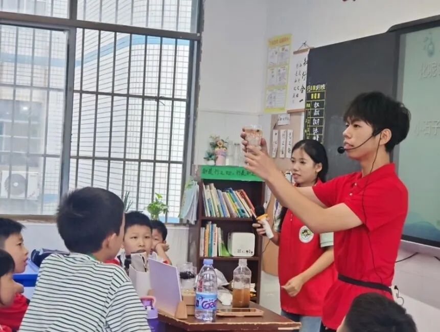 (图为志愿者给孩子们讲解简易净水器的组成)