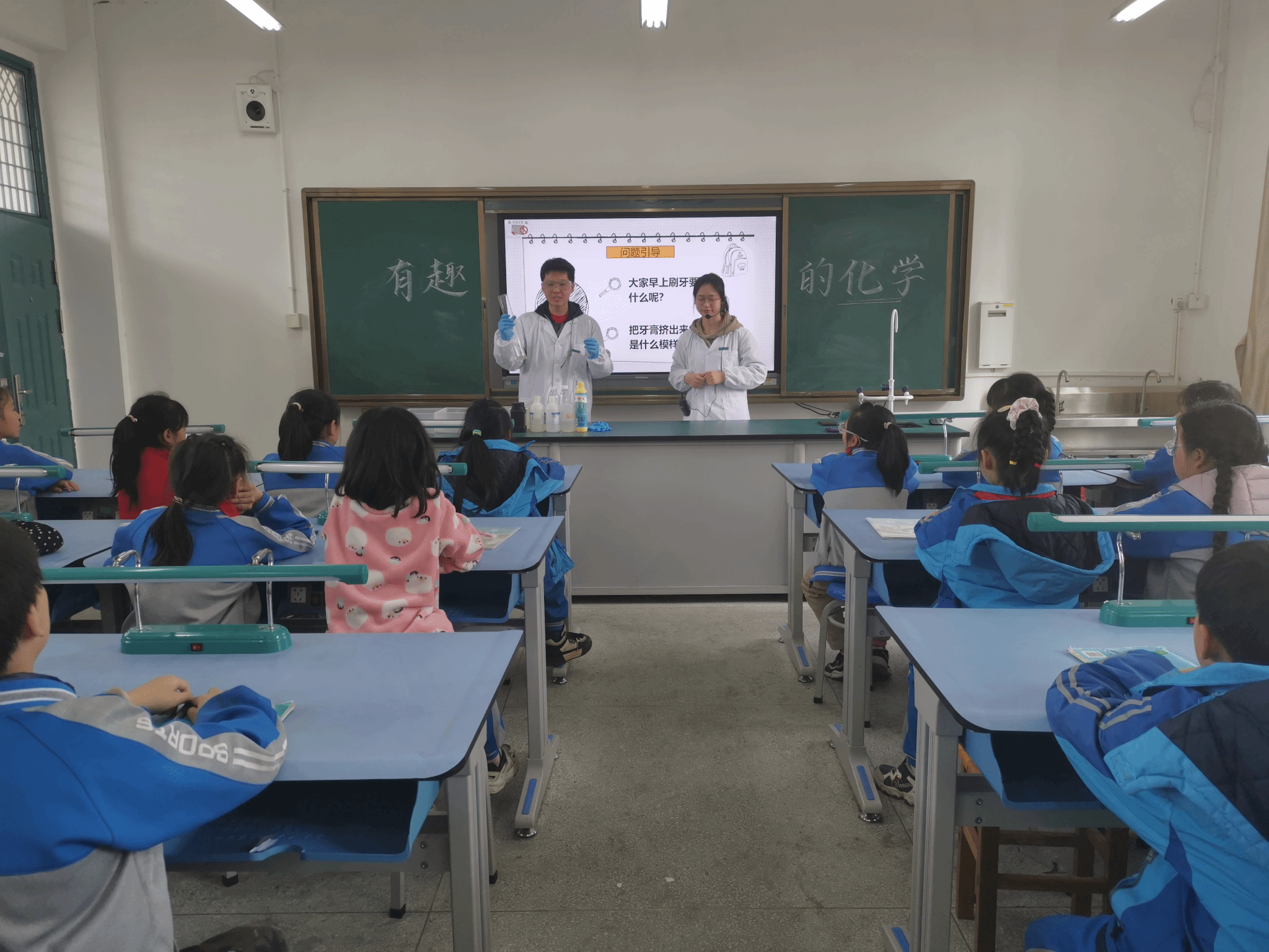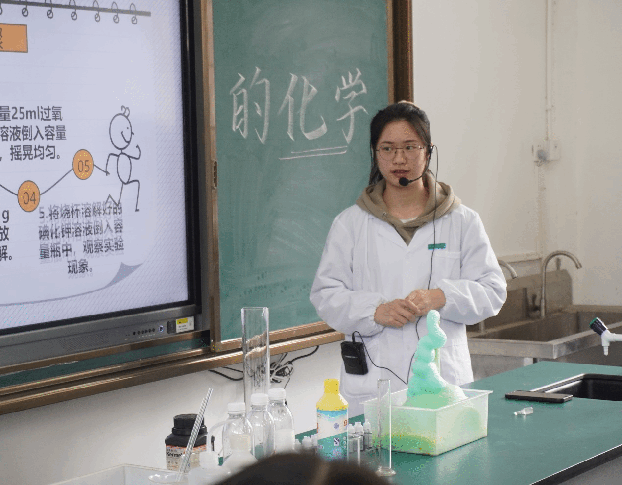 “铁为什么会生锈”“木材燃烧后为什么会变成木炭”,志愿者李依丹用一系列问题激发了孩子们对化学学科的好奇心,在观看了一段酷炫的趣味化学实验短视频后,同学们已经迫不及待地想要了解即将开展的趣味化学实验《大象牙膏》了。实验助手志愿者陈杰认真介绍了实验将要用到的“烧杯”“容量瓶”“量筒”等实验仪器和“防护服”“护目镜”“手套”实验防护用品。他穿戴好防护用具,按实验步骤认真细致地进行操作,并邀请小朋友们上台参与实验操作……在志愿者一系列操作后容量瓶中的泡沫不断喷涌而出,形状像挤出的牙膏,且泡沫上方飘有白雾,令孩子们惊叹不已。
