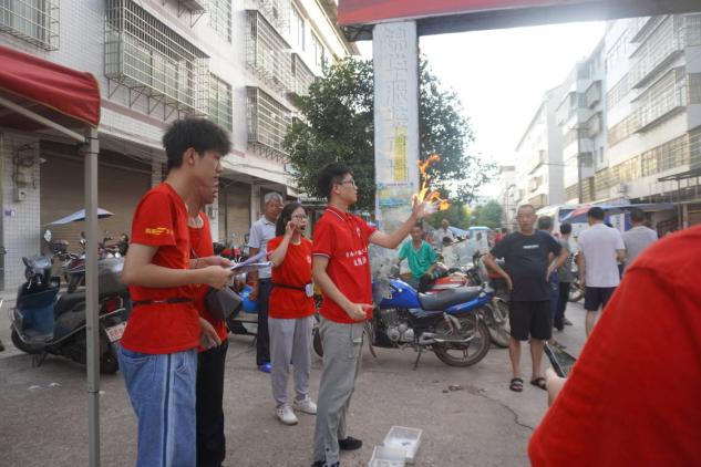 活动当天早上五点,晨光熹微,志愿者便收拾物资前往近尾洲农贸市场布置活动现场。科学魔术秀“火焰掌”,吸引了一批群众前来观望,熊熊燃烧的火焰如同火红妖艳的花蕊在手掌中绚丽绽放。随着群众逐渐增多,志愿者们结合村民生活生产中的实际问题,从“垃圾分类”“水资源保护”“农药对生态的危害”“土壤污染”等四个方面,阐述了环境保护意识的重要性。“垃圾分一分,环境美十分”,志愿者们向村民们详细讲解了垃圾分类的重要性,通过垃圾分类道具向大家介绍了不同种类垃圾的标志和处理方法,向村民传递绿色、生态和环保理念。志愿者们还告诉村民垃圾乱扔会严重污染大气和城市环境,过度使用农药对水资源、土地资源和空气资源的污染危害,号召村民们要行动起来,为青山添绿,让乡村更美。