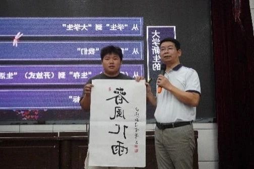 张云峰书记一上台便以幽默诙谐的语言调动了活动气氛,现场掌声十分热烈。而后,他从环境、人际、学习、生活等方面分析了新生在大学中可能遇到的适应问题,鼓励同学们从身、心、灵三方面进行调整,逐渐适应大学生活。此外,他还随机邀请现场同学上台分享自身感受,并赠送了自己的书画作品。接着,张云峰书记又以从“学生”到“大学生”、从“我”到“我们”、从(竞争式)“生存”到(开放式)“生活”、从“目的”到“目标”四个方面,鼓励大家树立大学生活的目标并不断努力,争取实现自我超越!