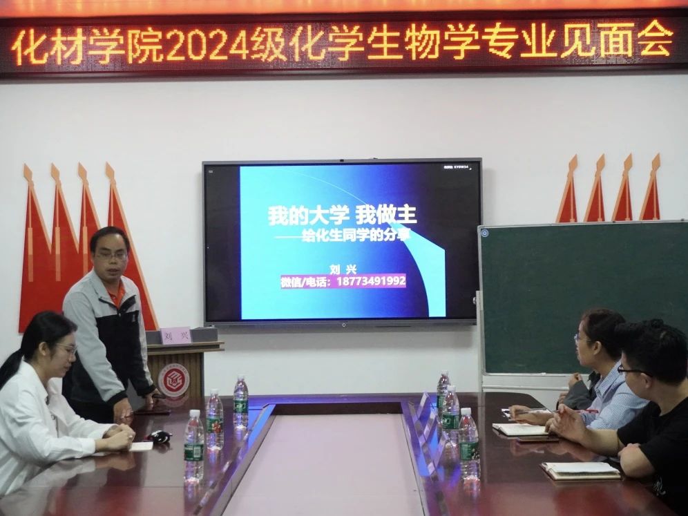 为使2024级化学生物学专业的学生深入了解本专业的人才培养目标、课程设置及就业前景等情况,科学合理地规划大学生活,2024年10月14日,物化与分析教研室主任刘兴老师牵头,诚邀张志坚老师、钟青梅老师在系楼105会议室开展了此次活动。学院党总支副书记阳曼、辅导员唐波湘以及2409班班主任陈阳老师与24级化学生物学全体学生参加了此活动。