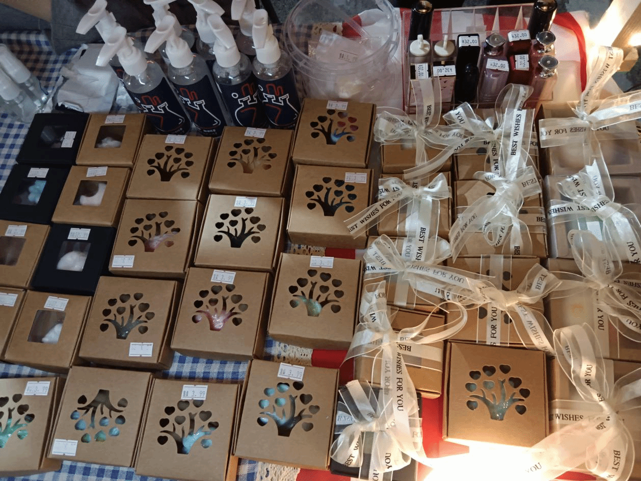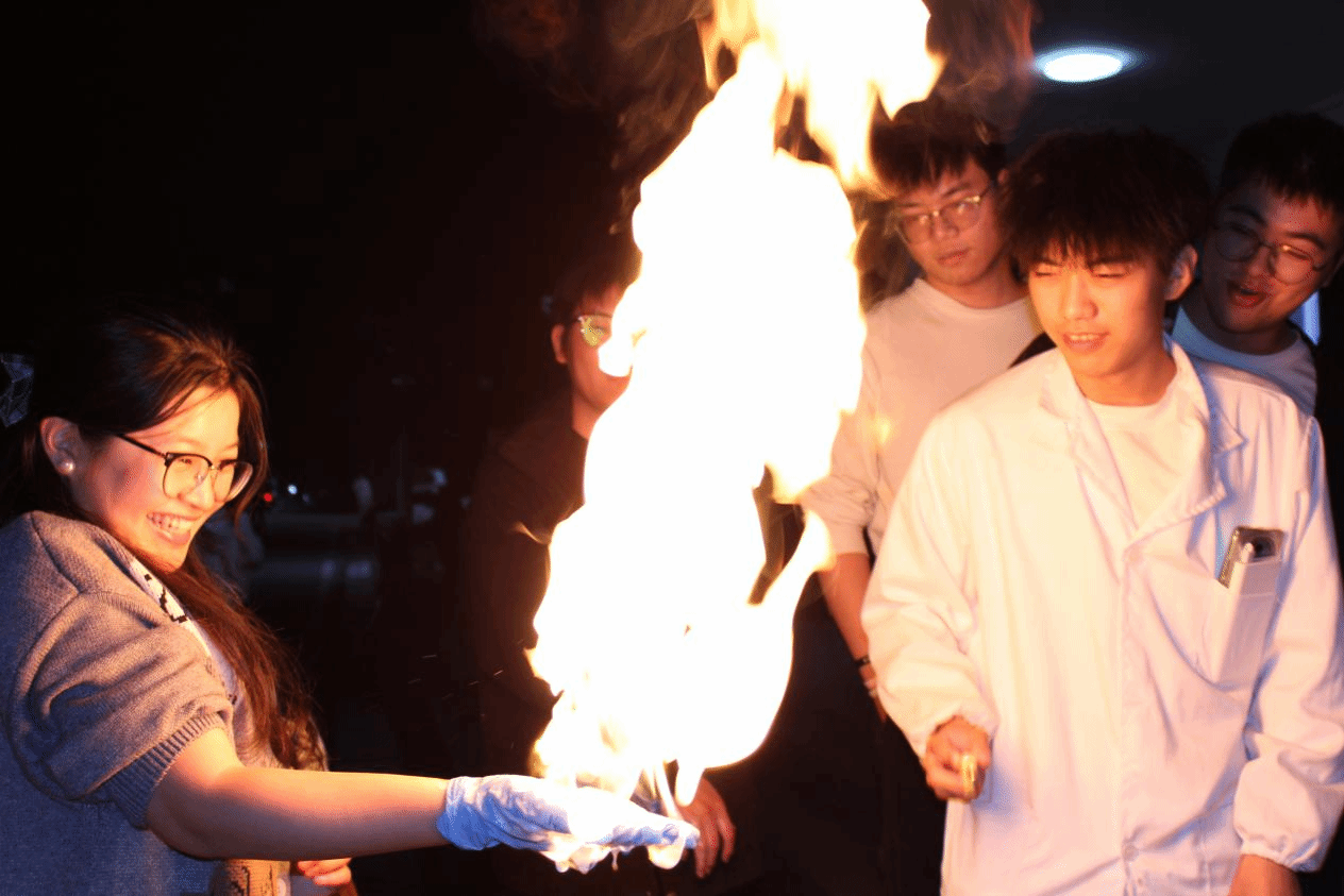展位上摆满的手工皂、口红、免洗洗手液等化学手工制品吸引了大家的注意力,工作室的科普员们热情地向同学们介绍这些产品的成份、功效与制作流程,还让大家体验了工作室新产品——“零添加剂”的护手霜。趣味化学实验展示环节,将现场活动氛围推至高潮。实验“火焰掌”让大家眼前一亮,只见熊熊燃烧的火焰在科普员手上跳跃,“焰色反应”中,科普员们在不同烧杯里给大家呈现出不同颜色的火焰,在科普员们讲解实验的原理以及应用后,观众们恍然大悟,他们积极举手,踊跃尝试,感受火焰在手掌间的跳动,让不同元素在黑夜呈现美丽火焰,体验着化学的浪漫与快乐。此外,化学知识问答与趣味化学游戏环节,观众们乐此不疲,参加“背诵元素周期表”“化学元素谐音成语”“化学元素谐音歌曲创作”等小游戏,领化学手工小产品。