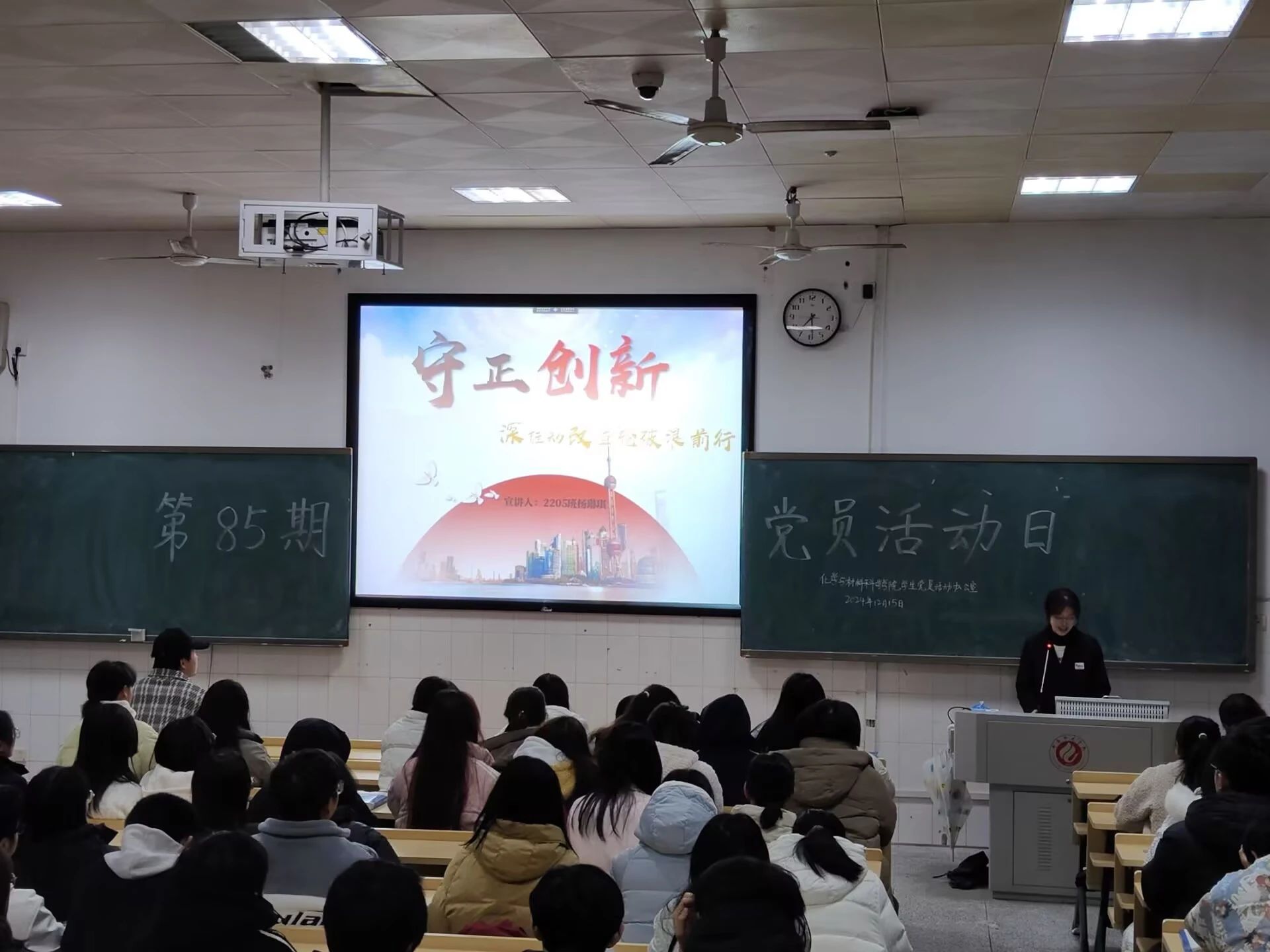 2024年12月15日晚,英国上市官网365第八十五期党员学习日活动于行知楼601开展,2205班杨琳琪同学以《“守正创新”推动深改巨轮“乘风破浪”》为题与全体学生党员和学习积极分子分享了她的学习心得。